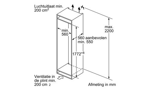 ++ Nishoogte (minimaal): 177,50 cm ++ Totale netto inhoud: 266 Liter ++ Vriesgedeelte ++