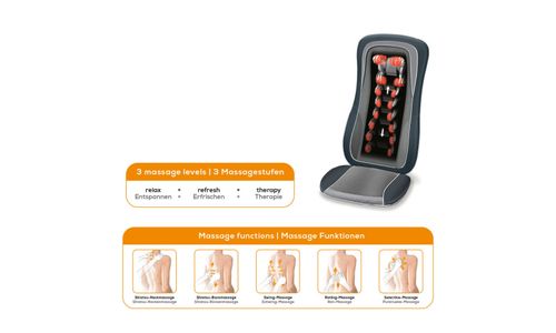 De MG 315 Shiatsu-stoelbekleding zorgt voor een ontspannende Shiatsu-, rol- of schommelmassage. De handmatige bedieningsschakelaar zorgt voor bedieningsgemak en het apparaat past de massage individueel aan uw lichaam aan met behulp van de automatische lichaamsscanfunctie.