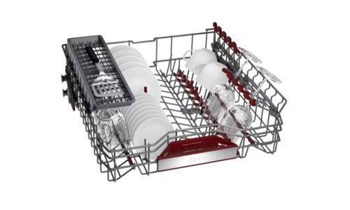 Creëer geriefelijke ruimte in een fractie van een seconde en verander het derde niveau in een veelzijdige bovenverdieping: ga voor de optionele Flex 3e mand met zijn schuifelement voor extra kopjes en kommen of kies onze Flex-besteklade voor bestek. Je servies past mooi in de onderste korf met 8 neerklapbare rekken en in de bovenste korf met 6 neerklapbare rekken. Zachte siliconen schuifbeschermers houden je glazen in de bovenste korf vast, en een hoger frame in de onderste korf biedt stevige steun aan hoge voorwerpen zoals snijplanken. Ervaar hoe soepel de korf op de kogelgelagerde wieltjes in de kuip schuiven en bemerk de handige korfstoppers op de voorwielen die ervoor zorgen dat je de korf niet over de deur trekt.
