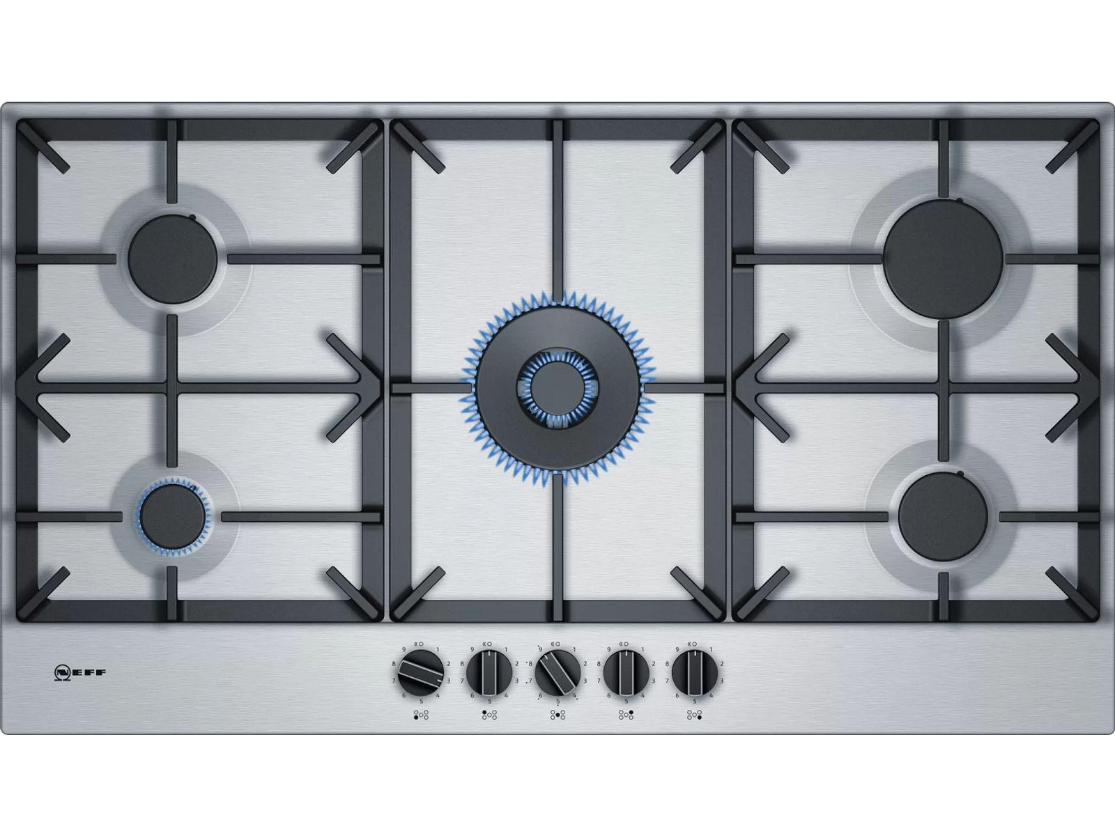 90 cm, inox, 5 branders (5 kW wok), draaiknoppen, FlameSelect