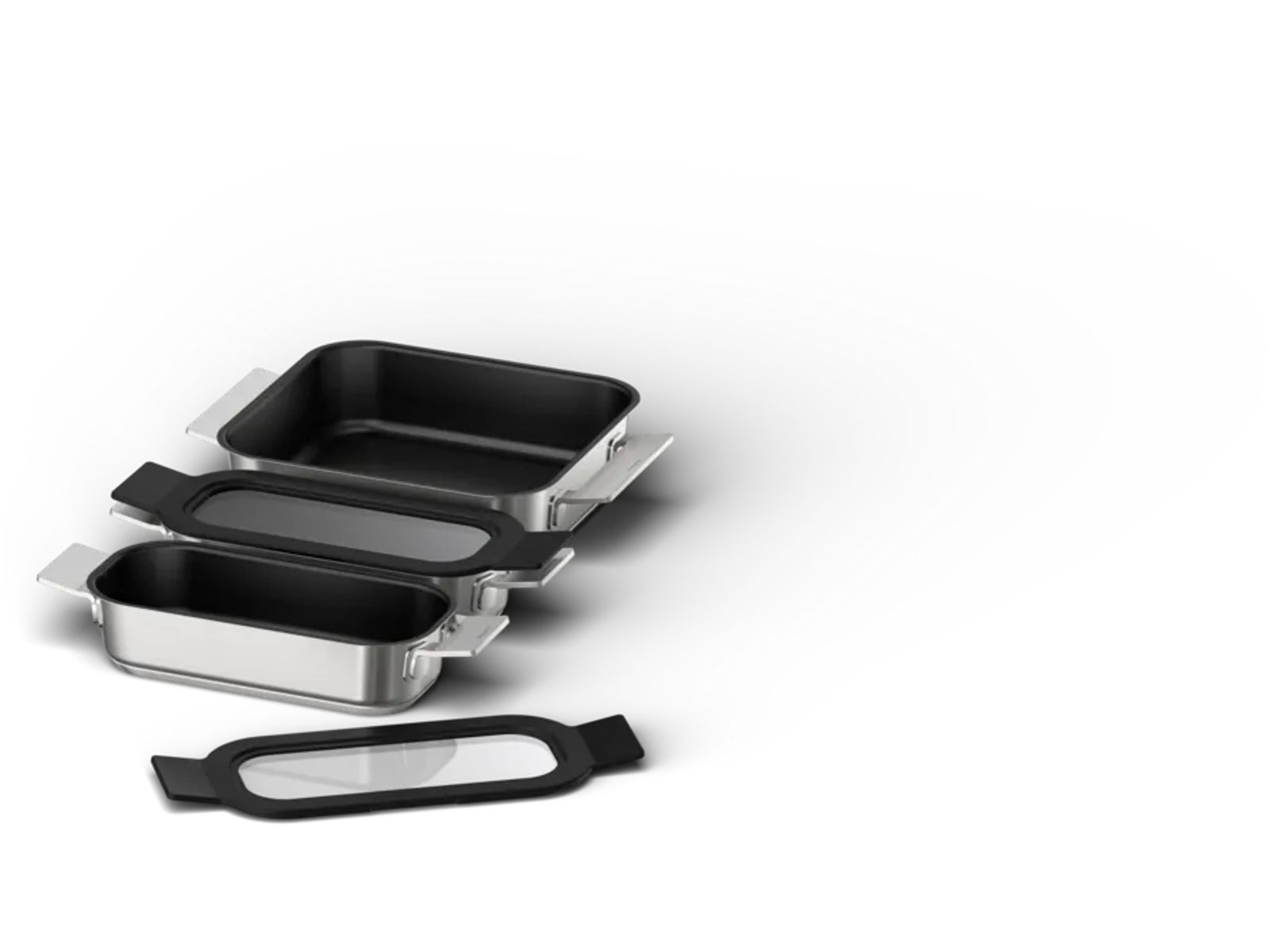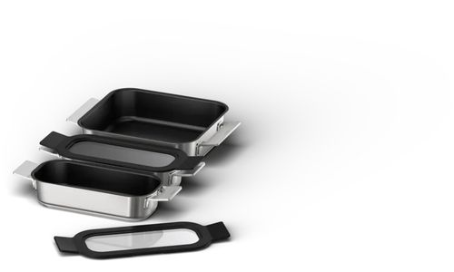 - 2 x Flex Pan klein met glazen deksel: 30 x 11 cm (bovenkant inclusief handgrepen) / 20 x 7,5 cm (onderkant)