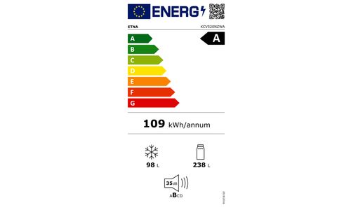 Laten we beginnen bij het laatste. De ETNA KCV520NZWA heeft energielabel A en verbruikt slechts 109 kWh per jaar! En dat met zijn formaat van ruim 2m hoog wat goed is voor 238 liter inhoud in het koelgedeelte en 98 liter vriesruimte. Dit model heeft zijn lage energieverbruik te danken aan de inverter compressor, welke ook zorgt voor een fluisterstille werking met een geluidsniveau van slechts 35 dB!